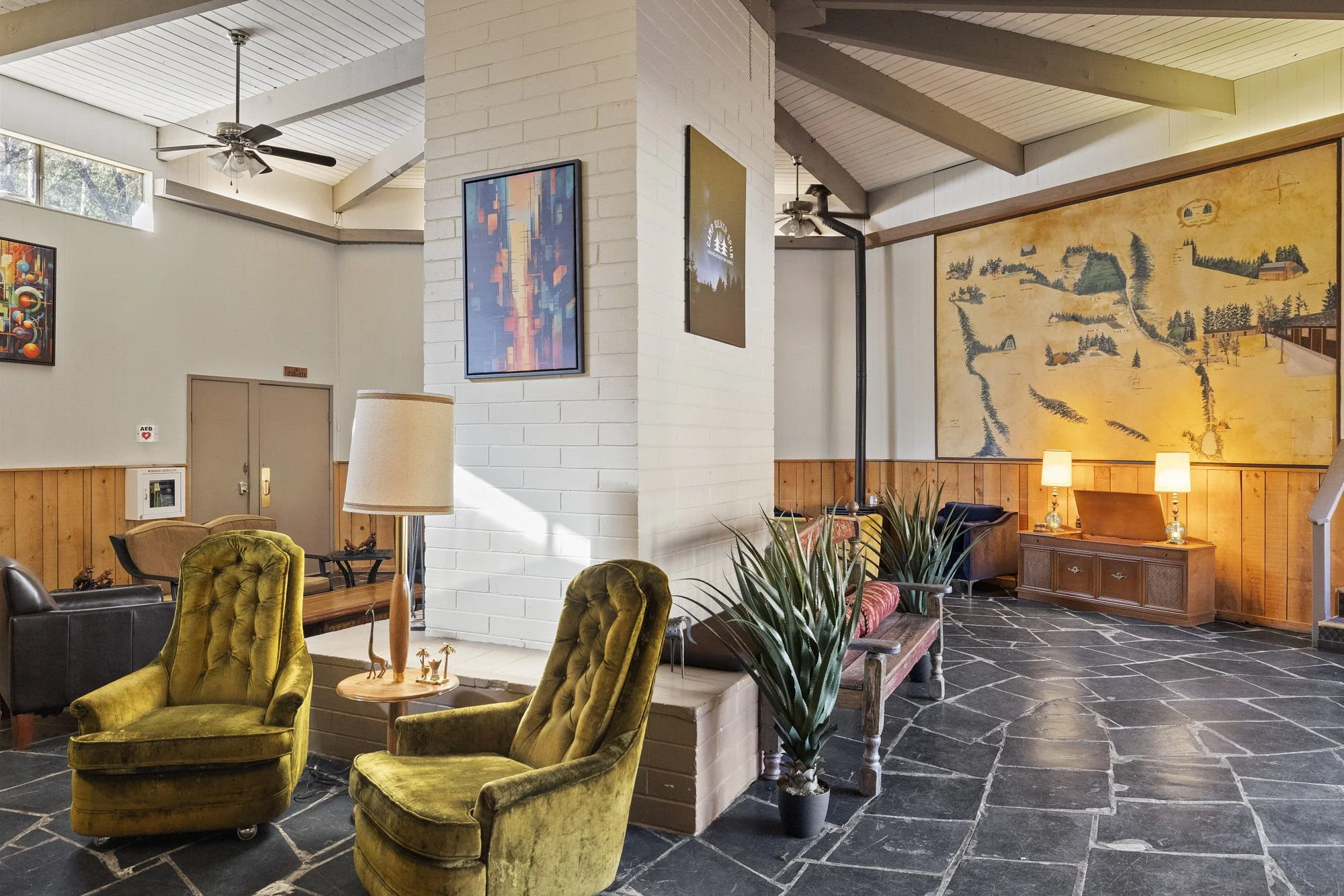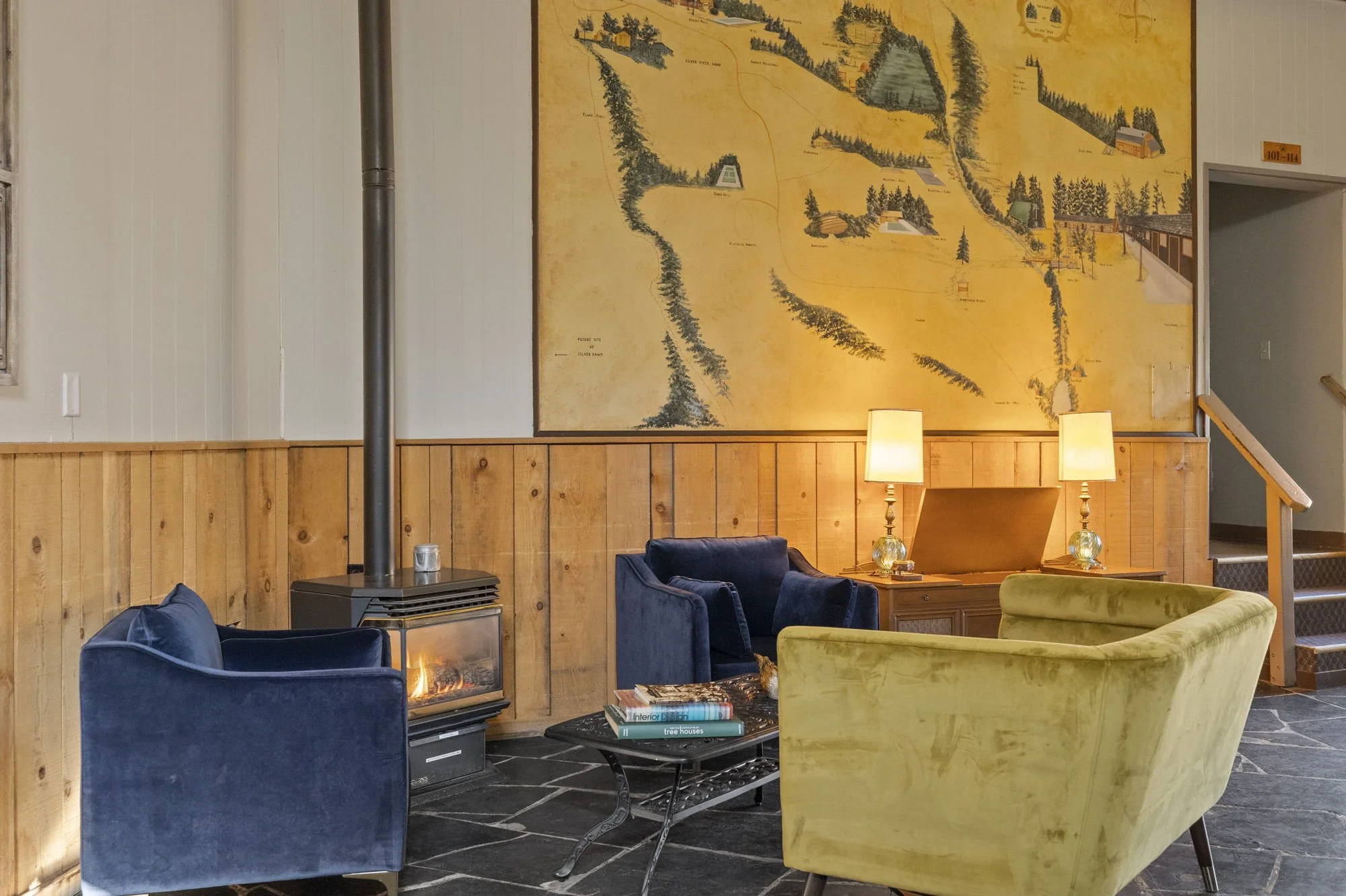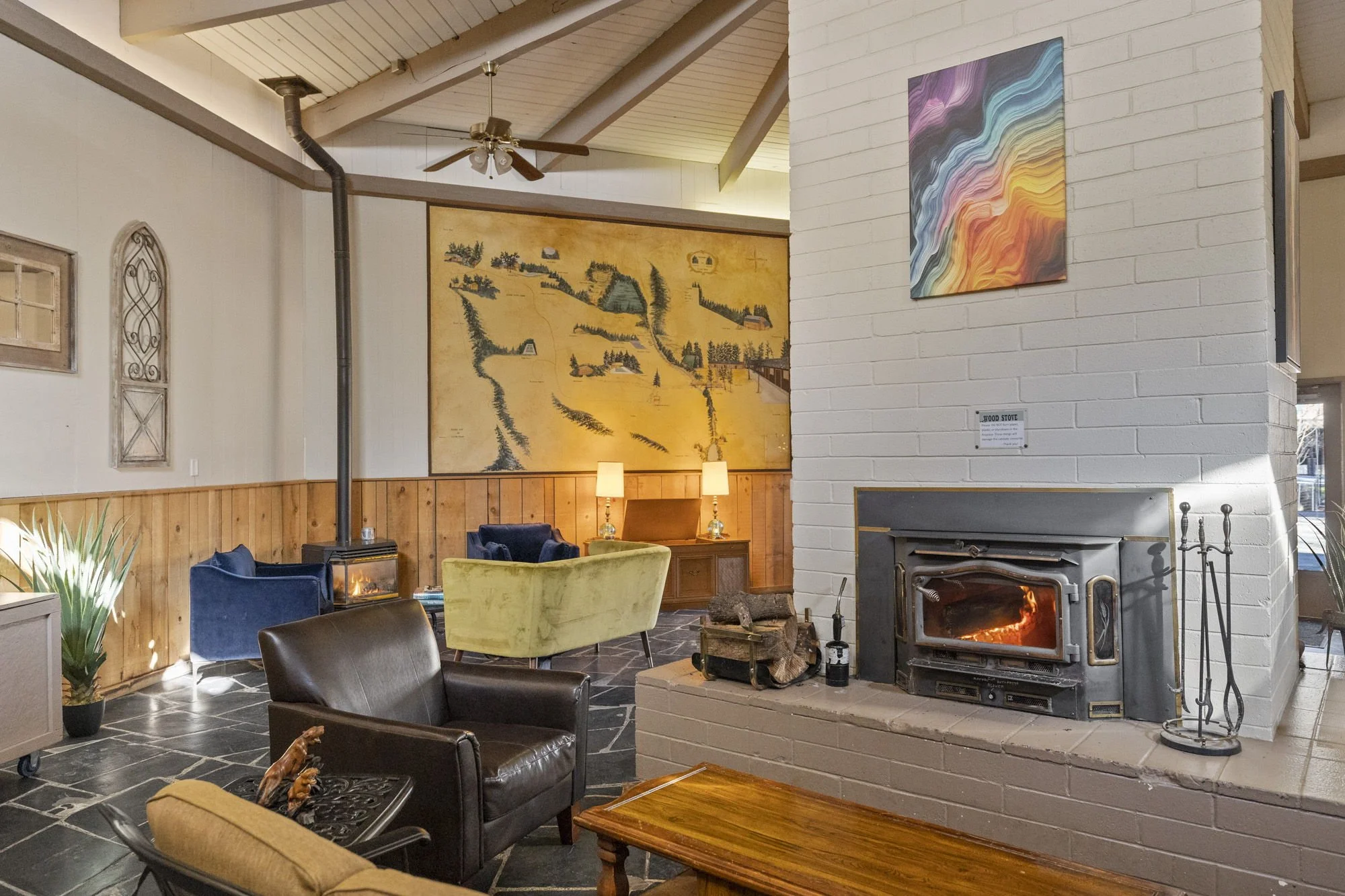 The lodge is located At the heart of base camp. Our welcoming lobby features mid-century furniture centered around a beautiful stone Fireplace.