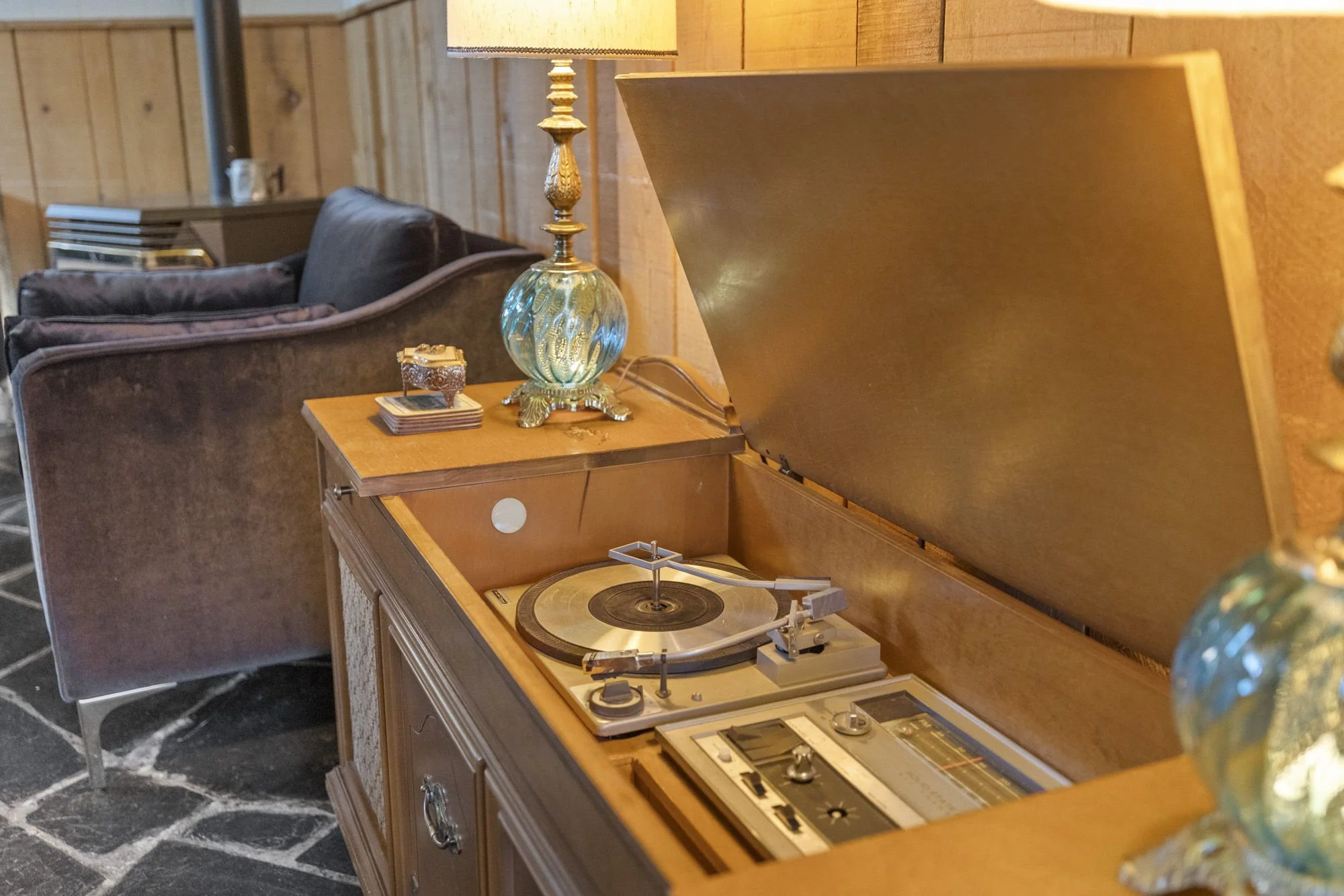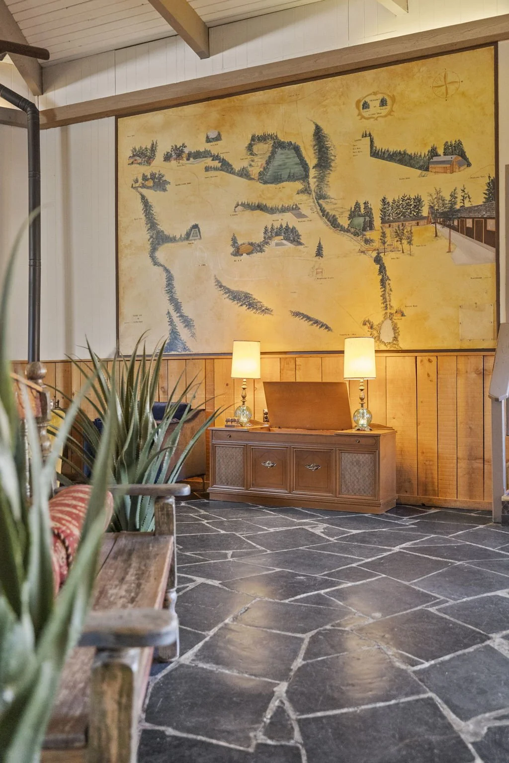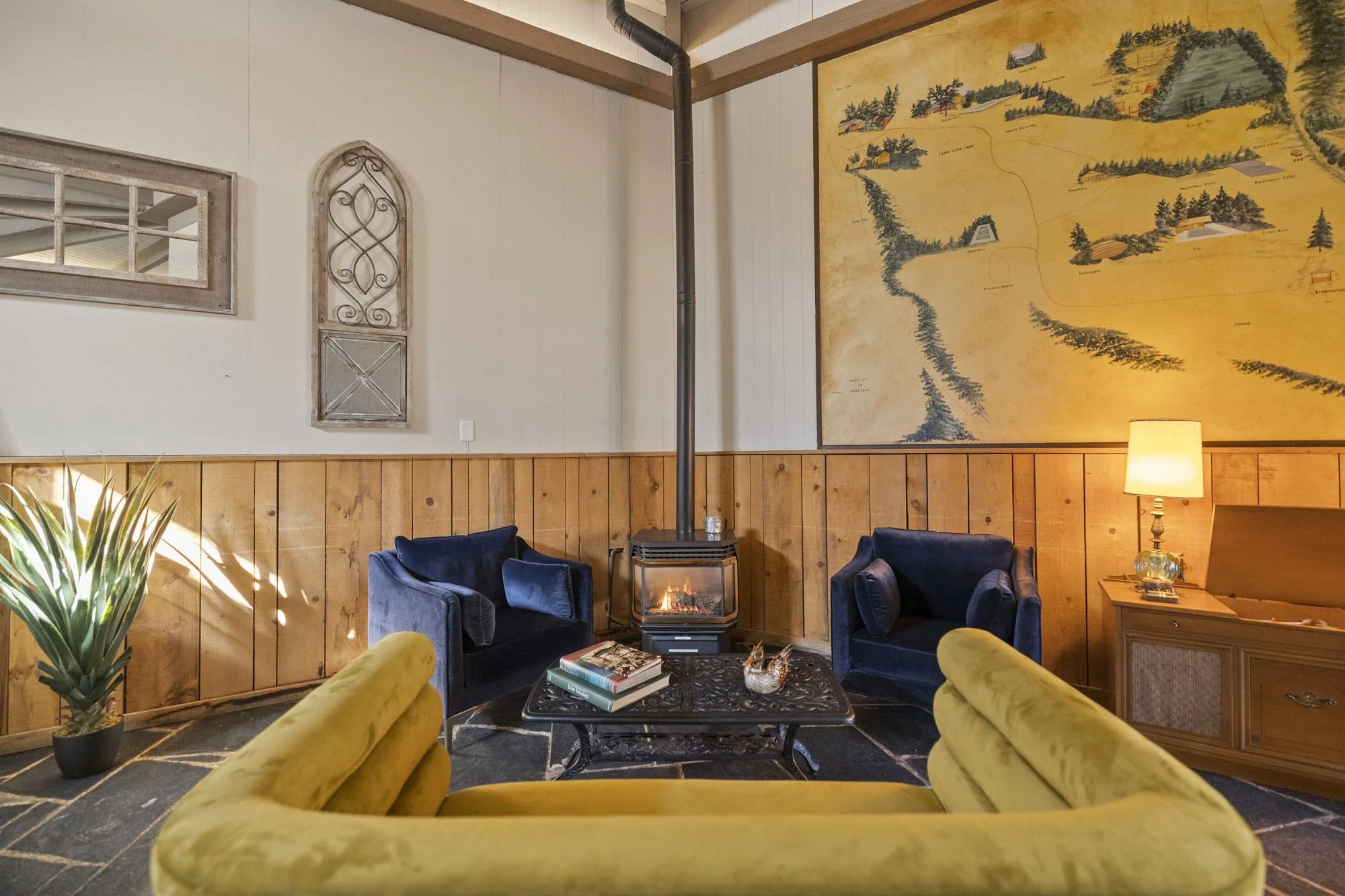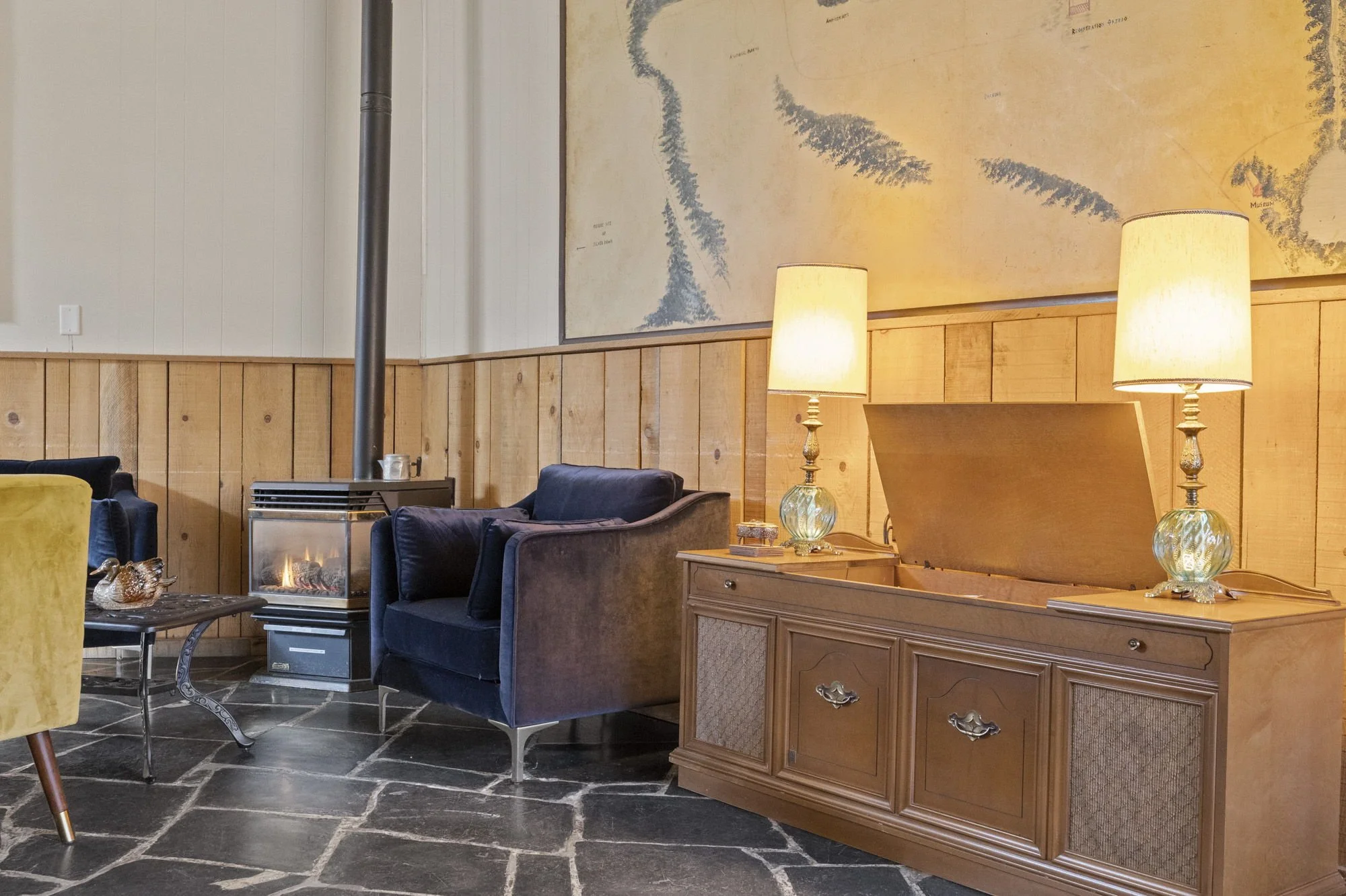 The lodge is located At the heart of base camp. Our welcoming lobby features mid-century furniture centered around a beautiful stone Fireplace.